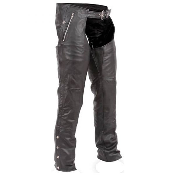 Outer Shell- Men's Black leather chaps with thigh stretch panels for flexible riding comfort.