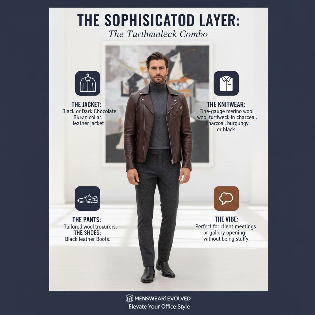 Transitioning your leather jacket from the street to the office is all about balance. By pairing it with "smart" staples like turtlenecks, chinos, and dress shirts, you create a look that is both respectful of the workplace and true to your personal style.