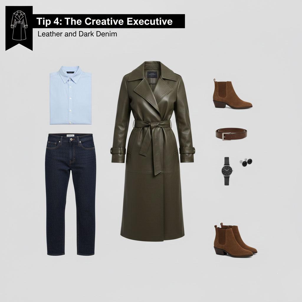 If you work in a creative agency or a modern tech firm, a full suit might feel too stiff. The leather trench allows you to stay professional while remaining approachable.