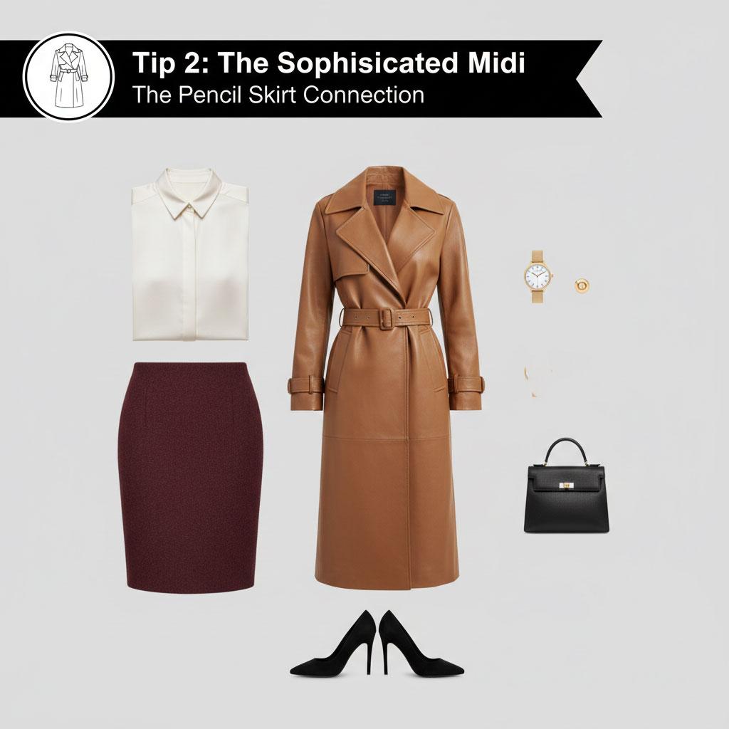 The Look: A high-waisted wool pencil skirt, a tucked-in silk blouse, and a tan or chocolate brown leather trench coat.